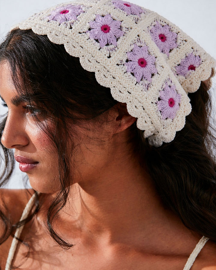 Bandana de crochet en tono crudo con flores en color lila. Diseño triangular con acabado calado y bordes ondulados.