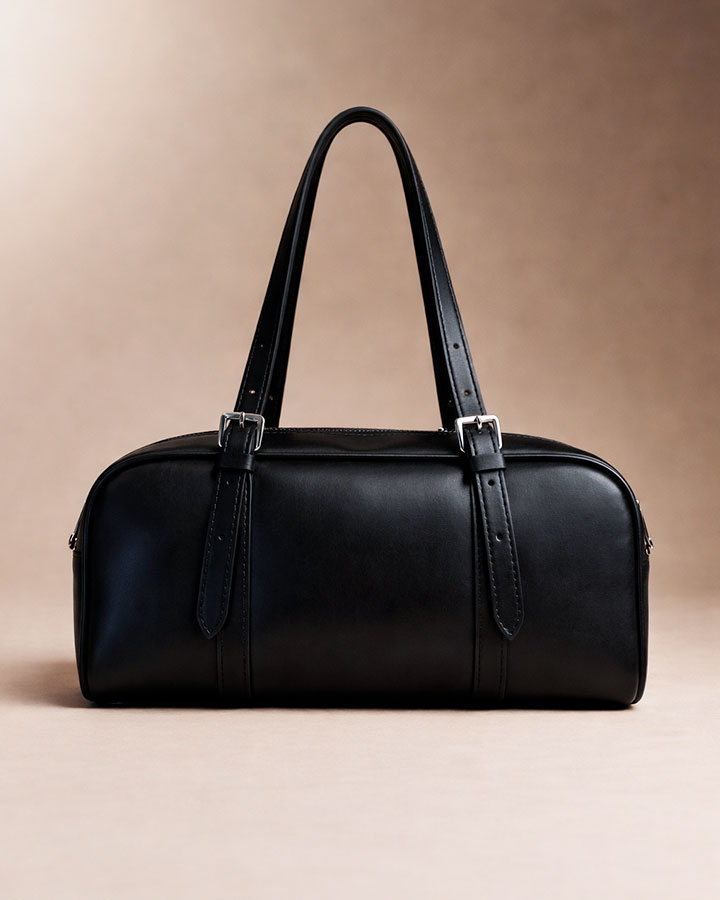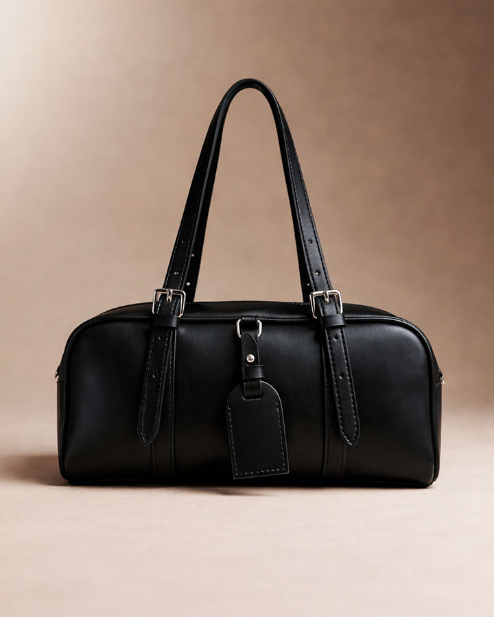 Bolso de piel en color negro con diseño estructurado y formato rectangular. Cuenta con doble asa ajustable para llevar al hombro y detalle de hebillas metálicas. Incluye etiqueta colgante decorativa.