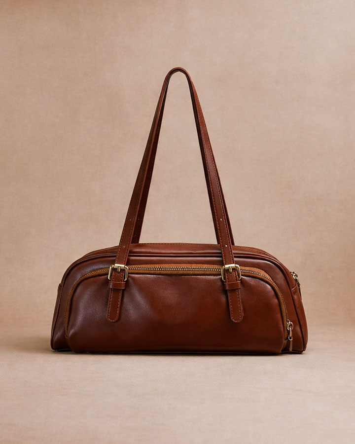 Bolso de piel en tono cuero con diseño estructurado y líneas depuradas. Presenta doble asa larga ajustable para llevar al hombro y cierre superior con cremallera. Su diseño es simétrico, con el mismo acabado en la parte delantera y trasera, lo que refuerza su estética equilibrada y atemporal. La piel lisa y su silueta alargada aportan elegancia y funcionalidad para el uso diario.