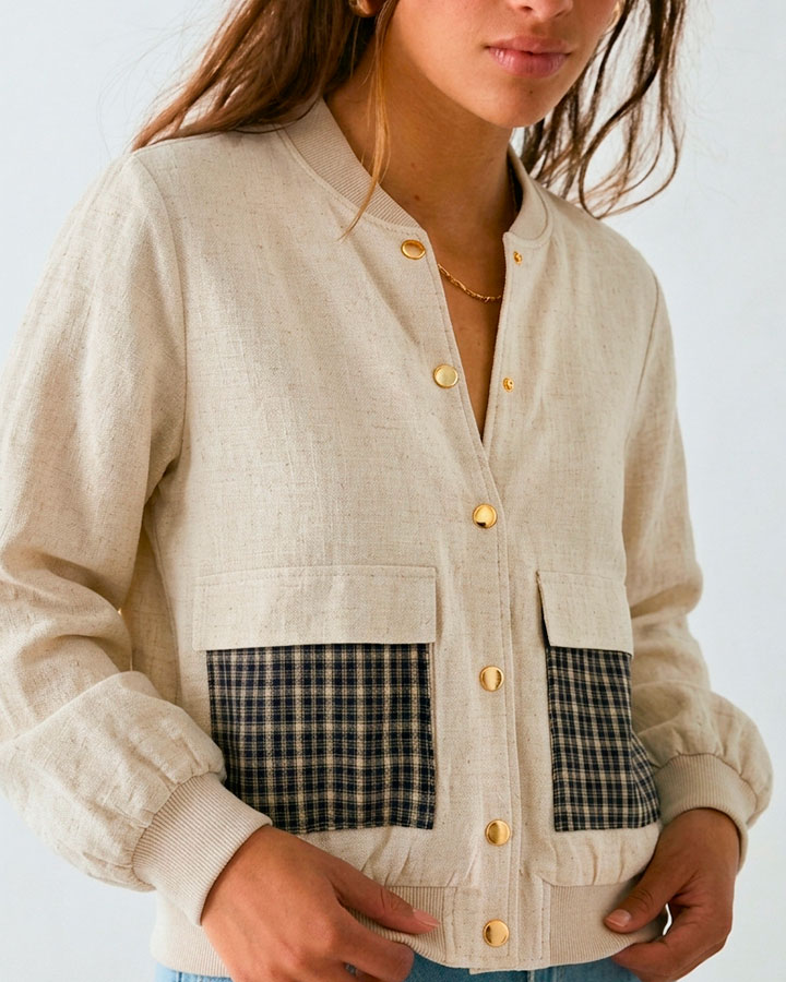 Diseño oversize con cierre frontal de botones metálicos. Cuello, puños y bajo en punto elástico. Presenta dos bolsillos delanteros funcionales con detalle de tejido a cuadros. Interior con forro para mayor comodidad.