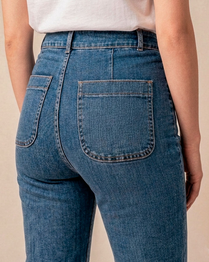 Tejano denim azul medio, con tiro alto y cierre delantero de doble botón.