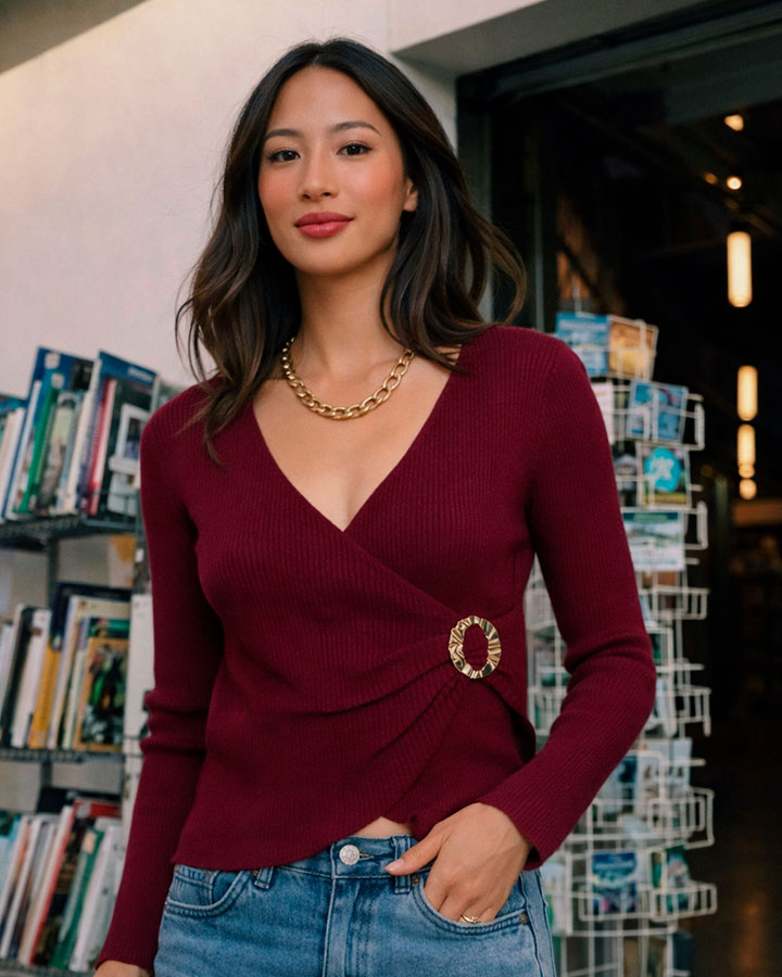 Tiene escote en pico y un diseño cruzado en la parte delantera, que se recoge en un lateral mediante un detalle dorado circular.