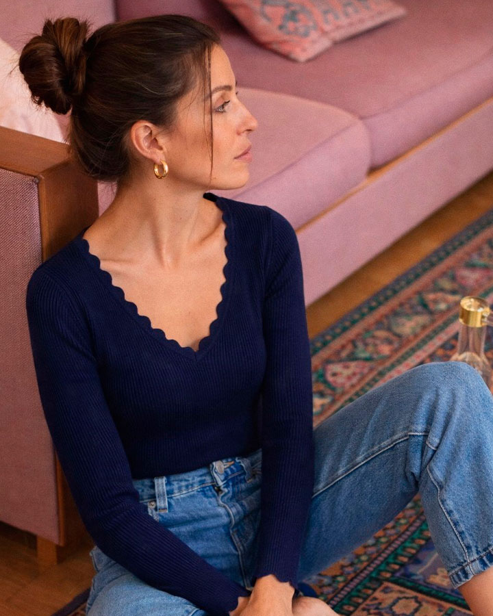 Jersey de canalé en color azul marino , confeccionado con un tejido suave y elástico que se adapta al cuerpo sin oprimir.