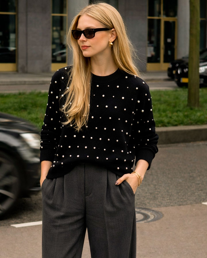 Con detalle de tachuelas decorativas distribuidas por la parte delantera y mangas de la prenda, que aportan textura y un acabado especial. Cuello redondo manga larga.