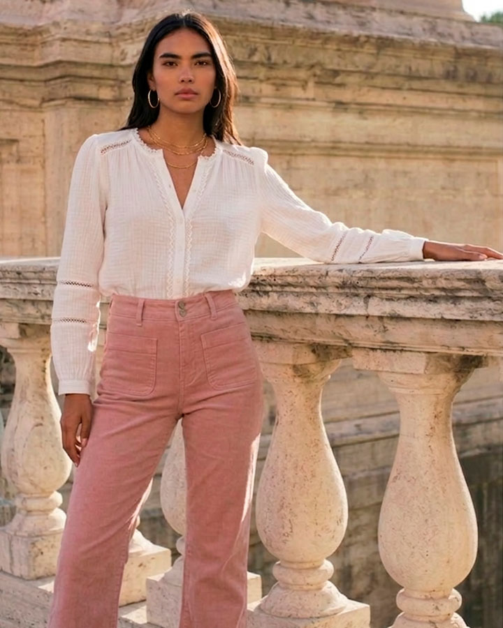 Pantalón de tiro medio confeccionado en tejido estructurado con ligera elasticidad. Diseño de pernera recta con bajo ligeramente acampanado y bolsillos delanteros de parche que aportan carácter a la prenda. Incorpora bolsillos traseros y cierre frontal con botón y cremallera.