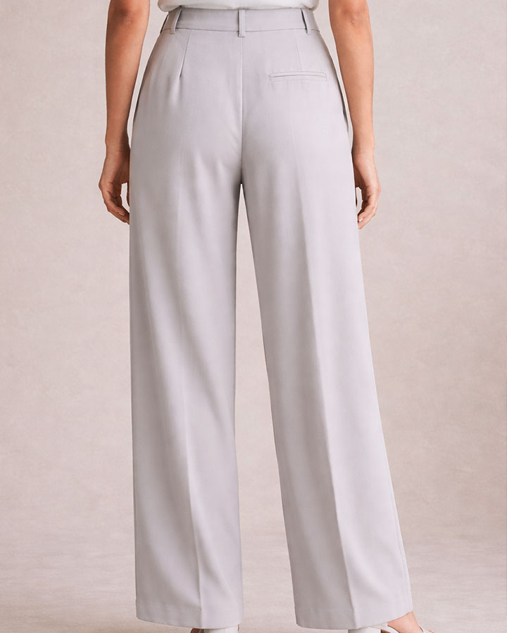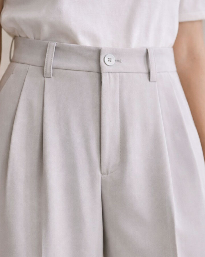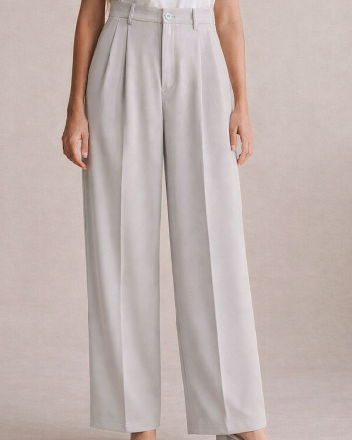 Pantalón de talle medio/alto en tono claro con pierna recta y caída amplia. Presenta pinzas delanteras que aportan estructura al diseño, cierre frontal con botón y cremallera, y trabillas para cinturón. El tejido fluido acompaña el movimiento y crea una silueta limpia y elegante, pensada para combinar con prendas ligeras o camisas de líneas sencillas.