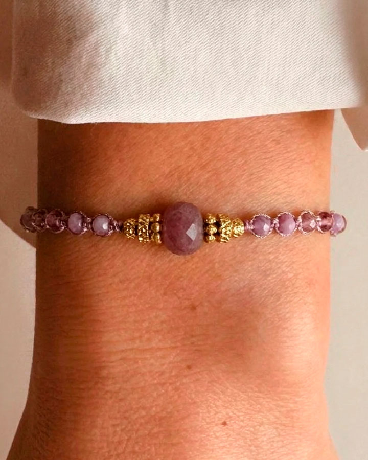 Pulsera de piedras naturales en tonos rosados y lilas, con pieza central facetada y pequeñas cuentas doradas. Presenta cierre con cadena ajustable y detalles metálicos en acero inoxidable. Al estar elaborada con piedras naturales, cada pulsera es única y el color puede variar ligeramente.