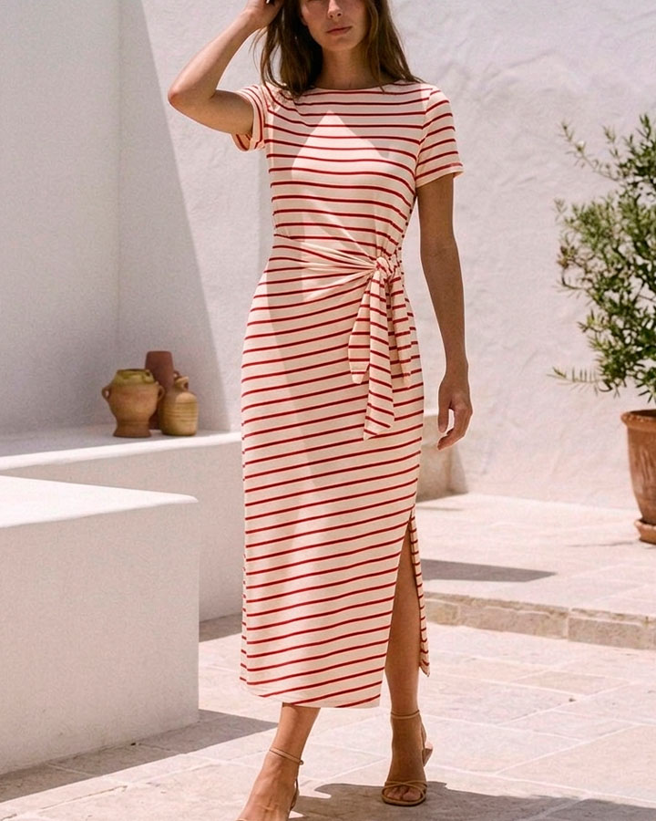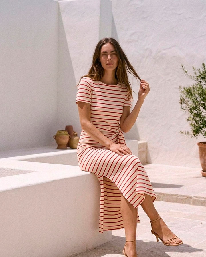 Vestido midi de punto suave con estampado de rayas en contraste y manga corta. Presenta escote barco y un detalle de nudo lateral que crea un ligero drapeado en la cintura, definiendo la silueta de forma natural. El tejido elástico se adapta al cuerpo con comodidad y la abertura lateral aporta movimiento y ligereza al conjunto.
