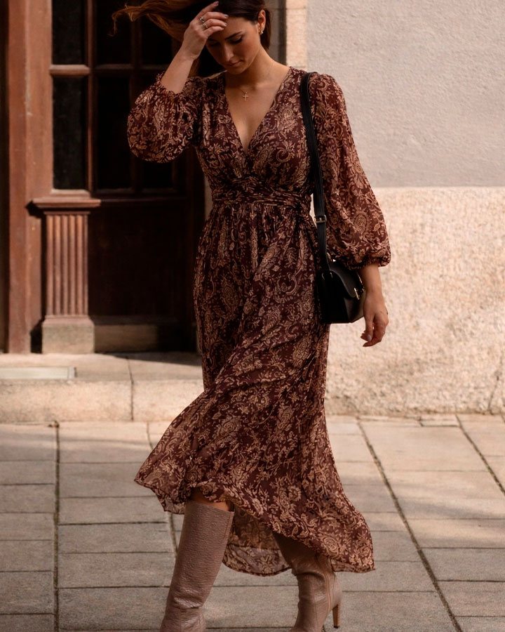 Vestido con estampado en tonos marrones beige y granate. Confeccionado en tejido fluido y ligero, presenta una caída suave y movimiento natural.